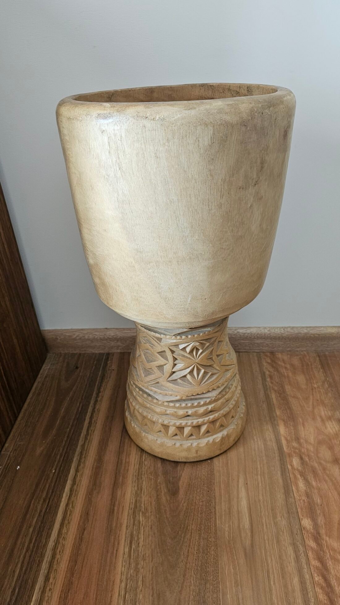 This lush 12.5 inch drum is made from light weight Melina, a best west african tone wood known for it’s balance of weight and sound. Beautifully carved, a master piece to sit in the corner of the lounge room but better played!